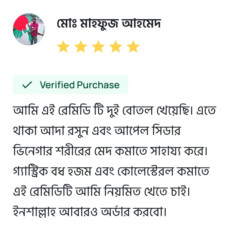 উত্তর : ইতালি থেকে আমদানিকৃত অর্গানিক আপেল সিডার ভিনেগার এর সাথে আদা, রসুন, লেবু ও খাঁটি কালোজিরা ফুলের মধুর সমন্বয়ে রেমেডিটি প্রস্তুত করা হয়।